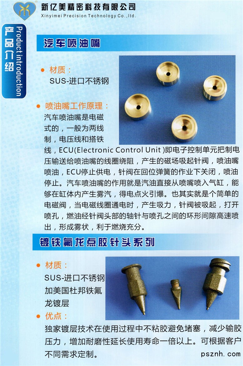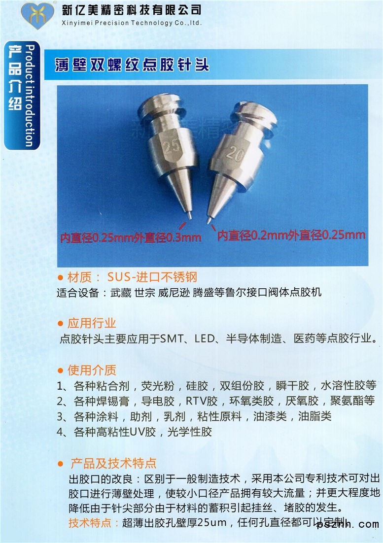 深圳市新億美精密科技有限公司是一家集研發(fā)、生產(chǎn)、銷售于一體的高科技企業(yè)。我司專注于超高精密不銹鋼零件設計、制造;并可根據(jù)用戶樣品或圖紙?zhí)峁┊a(chǎn)品,根據(jù)客戶需求定制各種高精度非標配件。 產(chǎn)品廣泛應用于電子行業(yè),并提高生產(chǎn)效率和生產(chǎn)質(zhì)量,同時可以降低企業(yè)的生產(chǎn)成本等,因此深得業(yè)內(nèi)人士的信賴,并獲得業(yè)內(nèi)人士的高度評價。 點膠針頭的精度也隨著各種點膠工藝的發(fā)展,對點膠效果產(chǎn)生很大的影響,點膠針頭的要求也越來越高,精度不但由點膠閥決定,對點膠針頭的要求更加高,高精度的點膠針頭就發(fā)揮著更大的左右,特別是應用于LED,光通訊等微量點膠行業(yè)。