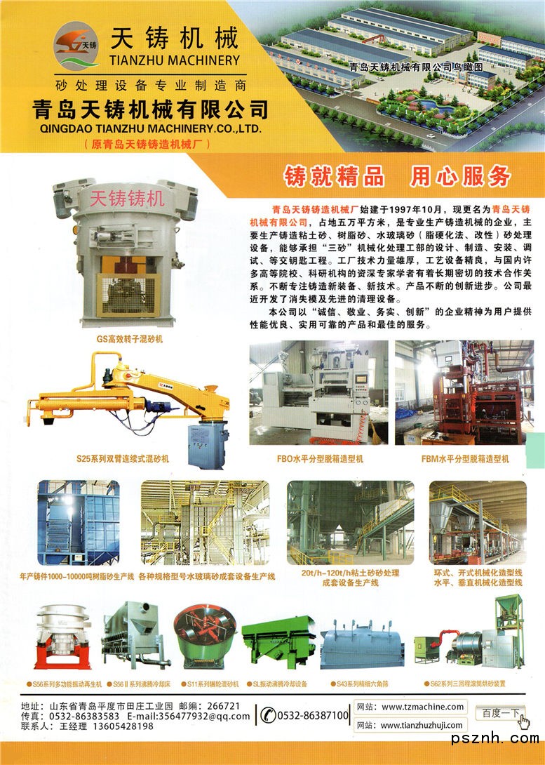 青島天鑄機械有限公司(原青島天鑄鑄造機械廠),始建于一九九七年,占地面積50000平方米,是集科研、設(shè)計、制造、安裝調(diào)試于一體的鑄造機械專業(yè)生產(chǎn)廠家;原機械工業(yè)部鑄造機械定點生產(chǎn)企業(yè);已通過ISO9001質(zhì)量體系認證。本廠在鑄造砂處理設(shè)備的研制開發(fā)中,先后開辟了國內(nèi)S14系列混砂設(shè)備、冷凝樹脂砂再生設(shè)備的新領(lǐng)域。本廠與國內(nèi)許多高等院校、科研機構(gòu)的資深專家學者有著長期密切的技術(shù)合作關(guān)系,先后研制成功了20多個類別、200多種新產(chǎn)品。