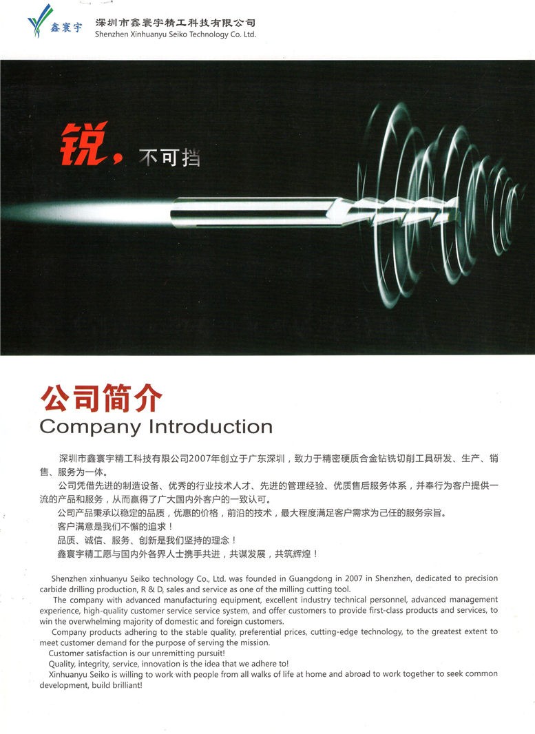 深圳市鑫寰宇精工科技有限公司創(chuàng)立于2011年,坐落于全球制造中心重鎮(zhèn)---深圳沙井,是一家集專業(yè)研發(fā)、生產(chǎn)、銷售、服務(wù)為一體的精密刀具生產(chǎn)廠家,專注于PCB專用鉆咀(0.20mm—6.50mm)、鑼刀(0.30mm—3.175mm)、鋁基板專用銑刀(0.80mm—3.175mm)和單刃刀、雕刻刀、左/右鉆(中心鉆/定位鉆),為全球的PCB\FPC\SMT及雕刻行業(yè)提供高端優(yōu)質(zhì)的產(chǎn)品和服務(wù)。