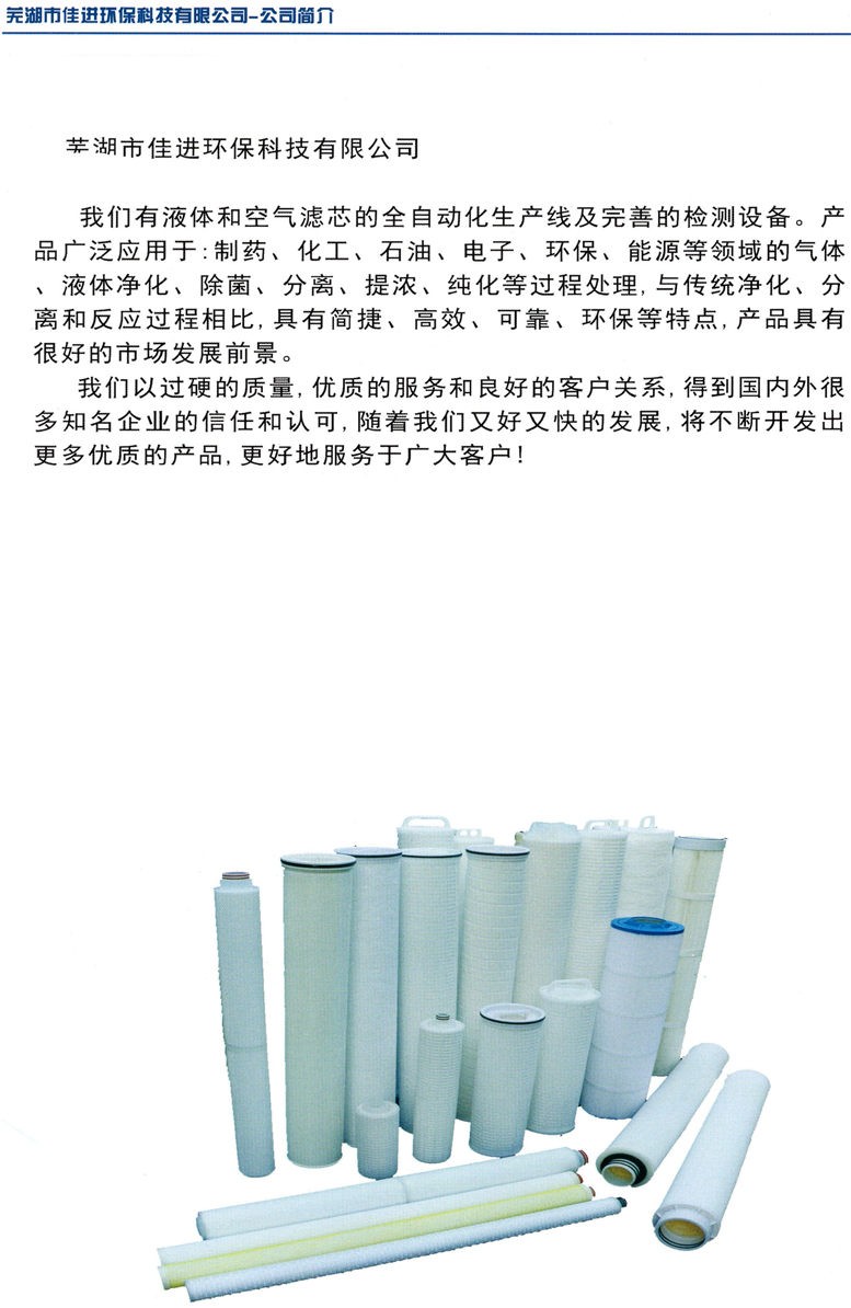 蕪湖市佳進環(huán)保科技有限公司,是一家致力于研發(fā),設計,生產(chǎn)和推廣先進過濾技術,過濾材料及設備的民營企業(yè)。 我們有液體和空氣濾芯的全自動化生產(chǎn)線及完整的檢測設備。產(chǎn)品廣泛應用于:制藥,化工,石油,電子,保護環(huán)境,能源等領域的液體凈化,消菌,分離,提濃,純化等過程處理,與傳統(tǒng)凈化,分離和反應過程相比,具有簡潔,效率高,可靠,保護環(huán)境等特點,產(chǎn)品具有很好的發(fā)展前景。 我們有過硬的質(zhì)量,優(yōu)良的服務和良好的客戶關系,得到國內(nèi)外很多知名企業(yè)的信任和認可,隨著我們又好又快的發(fā)展,將不斷開發(fā)出更多優(yōu)良的產(chǎn)品,更加好的服務于廣大客戶。
