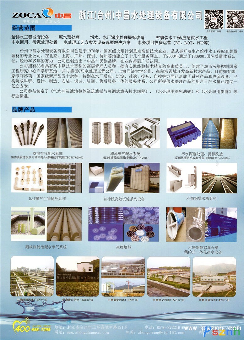 公司以“中承厚德,昌瑞天合”的精神,以創(chuàng)中國水工業(yè)品牌,樹中昌企業(yè)形象為目標,以誠信為本,用戶至尊的經營宗旨。三十多年來為國內二十多個省市及港、澳、臺地區(qū)和國外共5700多項工程服務,涉及市政、環(huán)保、石油、化工、冶金、醫(yī)藥等多個領域,所提供水處理產品的用戶日產水量已超過6800萬立方米。具備承擔大型給水工程能力,近年來已為北京水源九廠(150萬m3/日)、天津引灤工程新開河水廠(100萬m3/日)、貴陽西郊水廠(40萬m3/日)、武漢宗關老廠改造(80萬m3/日)、南京北河口(60萬m3/日)、黃河水源太原城市供水工程(40萬m3/日)以及“世界之最”的深圳東深源水生物硝化處理工程(400萬m3/日)、上海石洞口污水處理廠(40萬m3/日)、“亞洲之最”的東莞運河樟村水質凈化廠(260萬m3/日)、廣州自來水公司南洲水廠(40萬m3/日)、廣州亞運會配套工程廣州自來水公司新塘水廠(70萬m3/日)、廣州自來水公司西洲水廠(50萬m3/日),紹興縣江濱水處理設備有限公司(紹興縣印染產業(yè)集聚區(qū)污水集中預處理工程一期20萬m³/日)等工程配套服務,均以優(yōu)質的產品、精湛的技術和優(yōu)良的服務贏得用戶一致好評。