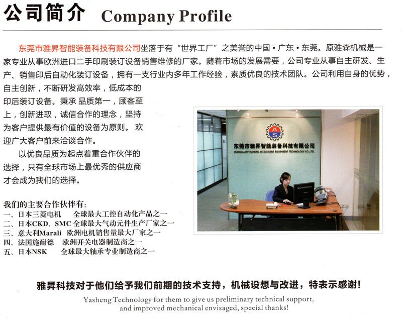 東莞市雅昇智能裝備科技有限公司坐落于有“世界工廠”之美譽的中國.廣東.東莞。是一家從事歐洲進口二手印刷裝訂設備銷售維修的廠家。隨著市場的發(fā)展需要,公司從事自主研發(fā)、生產(chǎn)、銷售印后自動化裝訂設備,擁有一支行業(yè)內(nèi)多年工作經(jīng)驗,素質(zhì)優(yōu)良的技術(shù)團。公司利用自身的優(yōu)勢,自主創(chuàng)新,不斷研發(fā)高l效率,低成本的印后裝訂設備。秉承“品質(zhì)優(yōu)良,顧客至上,創(chuàng)新進取,誠信合作的理念”,堅持為客戶提供有價值的設備為原則。歡迎廣大客戶前來洽談合作。以優(yōu)良品質(zhì)為起點著重合作伙伴的選擇,只有全球市場上優(yōu)l秀的供應產(chǎn), 才會成為我們的選擇。