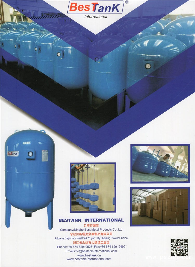 BESTANK產(chǎn)品被廣泛用于城市建設(shè)供水系統(tǒng),暖通空調(diào)制冷系統(tǒng),反滲透水處理系統(tǒng)、消防穩(wěn)壓系統(tǒng)、管閥水錘系統(tǒng) 鍋爐地暖太陽能供熱系統(tǒng)等領(lǐng)域,目前BESTANK可提供不同壓力等級8BAR,10BAR 16BAR 25BAR 從2L-40000L的壓力罐和意大利橡膠氣囊,BESTANK位于世界標(biāo)準(zhǔn)領(lǐng)域前沿, 并獲得多項(xiàng)國際權(quán)威認(rèn)證諸如:PED-CE/EN WRAS NSF61 GHOST DIN4807 ACS BS6920 ISO9001-2008 中國壓力容器D1簡單壓力容器制造許可證等。