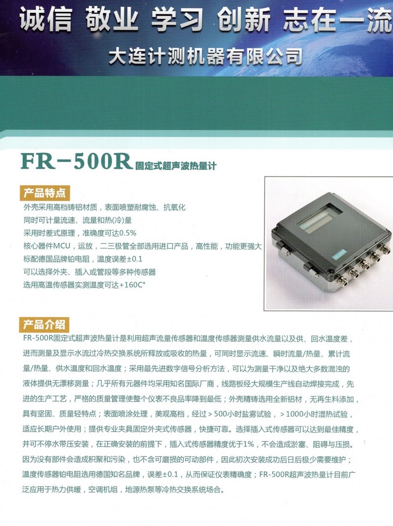 幾年來,由于計(jì)測(cè)人一直不斷追求卓越,追求創(chuàng)新,超越自我的工作信念,使產(chǎn)品的技術(shù)含量和市場(chǎng)份額逐年提高,公司于2014年隆重推出FR-500系列超聲波流量計(jì),此系列產(chǎn)品目前代表國內(nèi)同行業(yè)領(lǐng)先水平;公司擁有先進(jìn)水平的流量標(biāo)定裝置,該裝置的不確定度為1%,并通過ISO9001國際質(zhì)量體系認(rèn)證。良好的行業(yè)信譽(yù),嚴(yán)格的產(chǎn)品質(zhì)量是大連計(jì)測(cè)機(jī)器未來國際化發(fā)展的堅(jiān)實(shí)基礎(chǔ)和強(qiáng)有力保證。