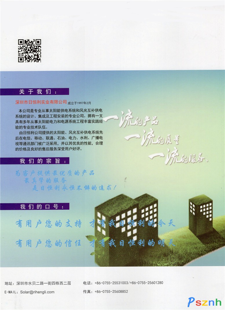 深圳市日恒利實(shí)業(yè)有限公司自1997年2月成立以來(lái),專門從事太陽(yáng)能、風(fēng)能的供電系統(tǒng)設(shè)計(jì)、制造、系統(tǒng)安裝調(diào)試及售后服務(wù)一攬子交鑰匙工程一直到今天,擁有一支具有多年從事太陽(yáng)能豐富實(shí)踐經(jīng)驗(yàn)的專業(yè)技術(shù)團(tuán)隊(duì)。不求最好,但求更好!始終如一,鍥而不舍的為用戶提供滿意的服務(wù)。