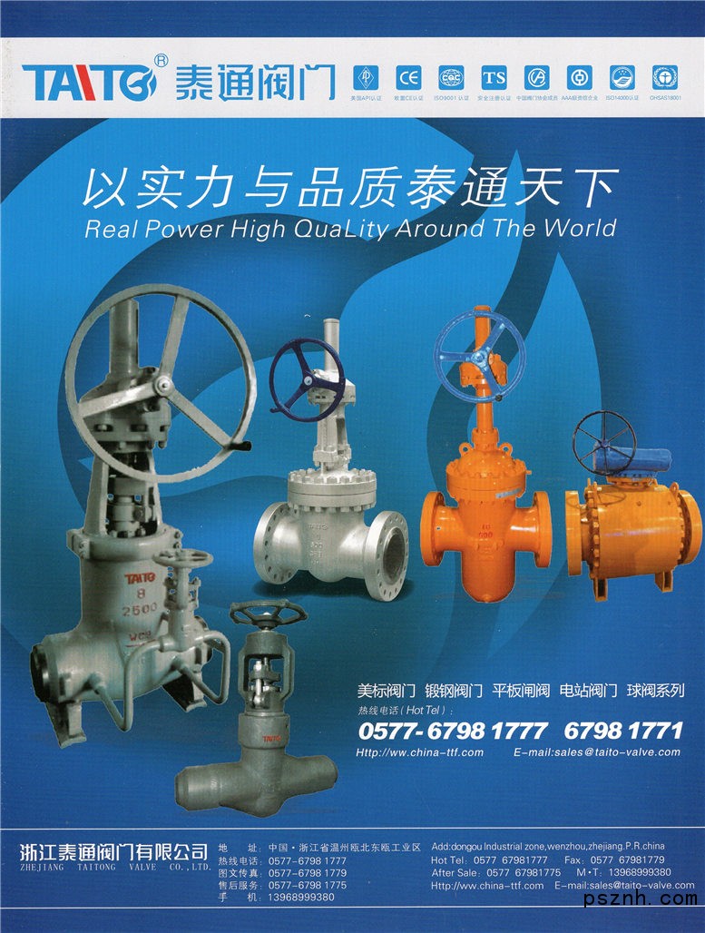 浙江泰通閥門有限公司是中國外向型、集團型閥門加工生產(chǎn)制造企業(yè)之一;由泰通集團總投資人民幣2000多萬元在全球聞名的泵閥之鄉(xiāng)——永嘉縣甌北鎮(zhèn)東甌工業(yè)區(qū)興建現(xiàn)代化的泰通工業(yè)園,占地面積25000多平方米,建筑面積達到20000多平方米。公司技術(shù)力量雄厚,設(shè)備精良,擁有數(shù)控車削中心,高效,高精度加工專業(yè)機器,現(xiàn)代化探傷設(shè)備等各類加工檢測設(shè)備200多臺。企業(yè)先后通過了IS090001,API,CE及AZ國際認證。
