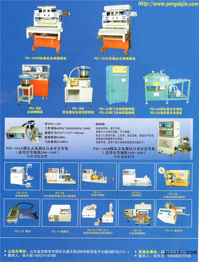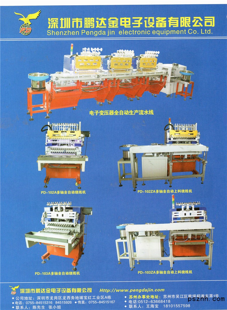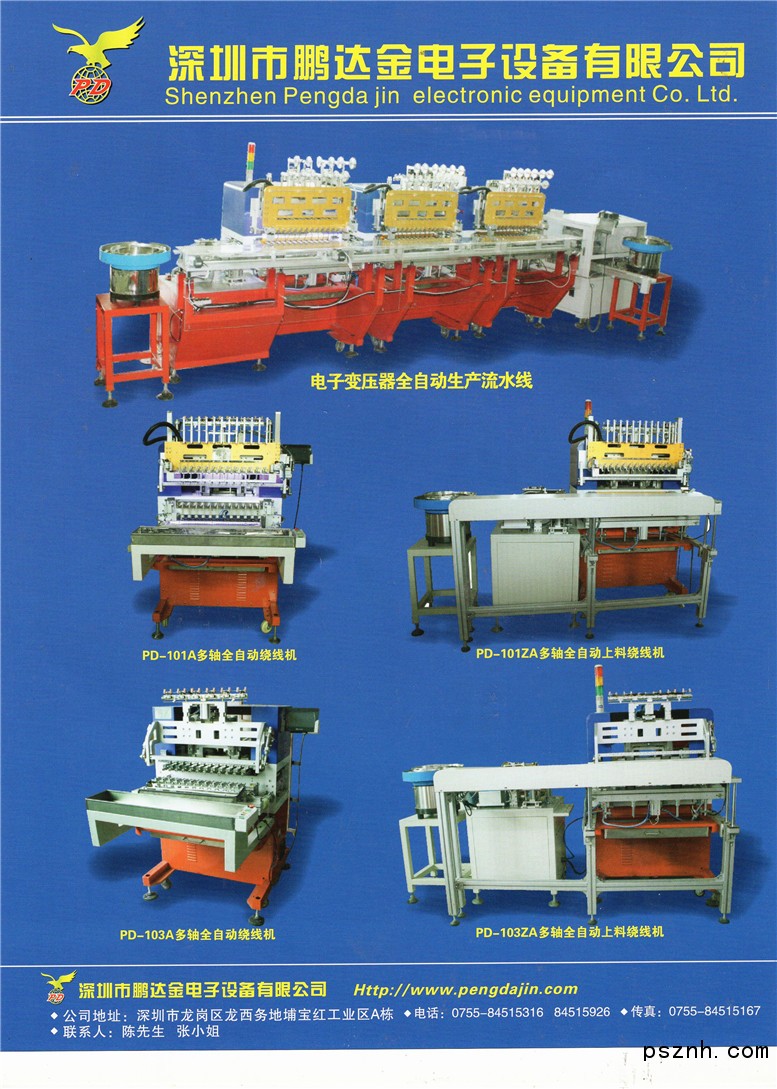 深圳市鵬達金電子設(shè)備有限公司  是國內(nèi)繞線機專業(yè)生產(chǎn)廠家,并與國內(nèi)有關(guān)繞線設(shè)備生產(chǎn)單位建立了廣泛信息聯(lián)系與合作關(guān)系。產(chǎn)品廣泛適用于各種變壓器廠的繞線(如:高頻變壓器、低頻變壓器、電感、繞圈等)。產(chǎn)品分為:高,低頻全自動繞線,全自動上料繞線機,全自動包膠機,自動焊錫機,自動無刷繞線機,整腳機,包膠帶機,手搖機,切帶機。錫爐,烤箱,真空含浸機,等變壓器相關(guān)設(shè)備。品種規(guī)格齊全。亦可以根據(jù)客戶的特殊要求設(shè)計與制造各種非標(biāo)準(zhǔn)繞線機及相關(guān)設(shè)備。