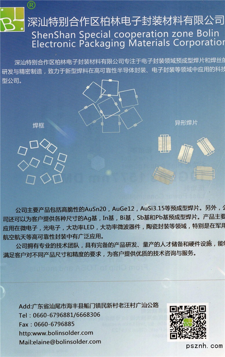 深汕特別合作區(qū)柏林電子封裝材料有限公司 電子封裝 預(yù)成型焊片 焊絲 金合金焊片 銀合金焊片 低溫鉍合金焊片