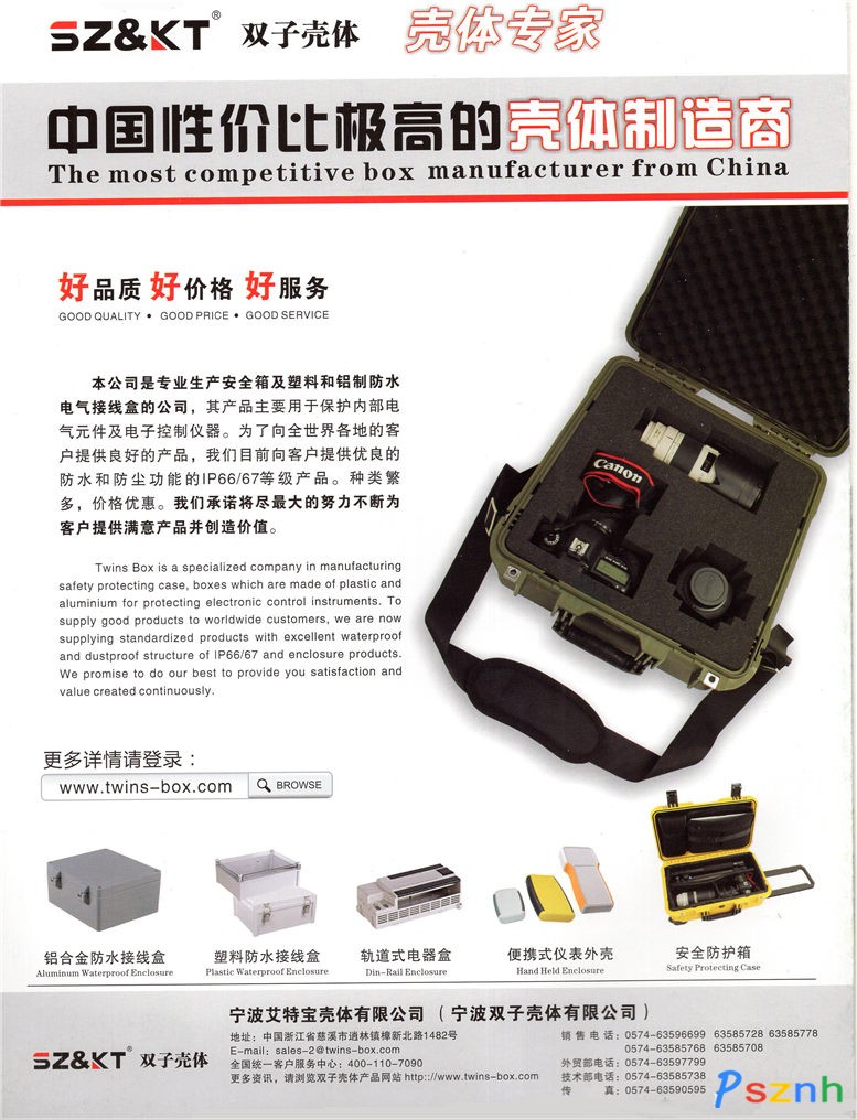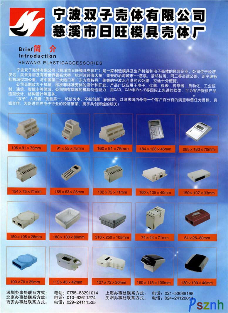 創(chuàng)始于1998年的寧波雙子殼體有限公司是一家專業(yè)生產(chǎn)塑料密封防護(hù)箱、塑料防水接線盒、鋁壓鑄接線盒等產(chǎn)品的民營(yíng)企業(yè),集研發(fā)、生產(chǎn)、銷售、服務(wù)為一體,其產(chǎn)品廣泛應(yīng)用于電子、儀器、儀表、通信、PLC、控制箱、自動(dòng)化等領(lǐng)域。公司擁有先進(jìn)的生產(chǎn)設(shè)備,專業(yè)的技術(shù)骨干,銷售團(tuán)隊(duì)和完善的產(chǎn)品檢驗(yàn)手段,積極在這行業(yè)做到領(lǐng)先,是國(guó)內(nèi)性價(jià)比最高的企業(yè)之一,如塑料密封防護(hù)箱,銷量更是突飛猛進(jìn)。公司更是先后通過(guò)ISO9001國(guó)際管理質(zhì)量體系認(rèn)證,ROHS、REACH等歐洲有害物質(zhì)檢測(cè)認(rèn)證。