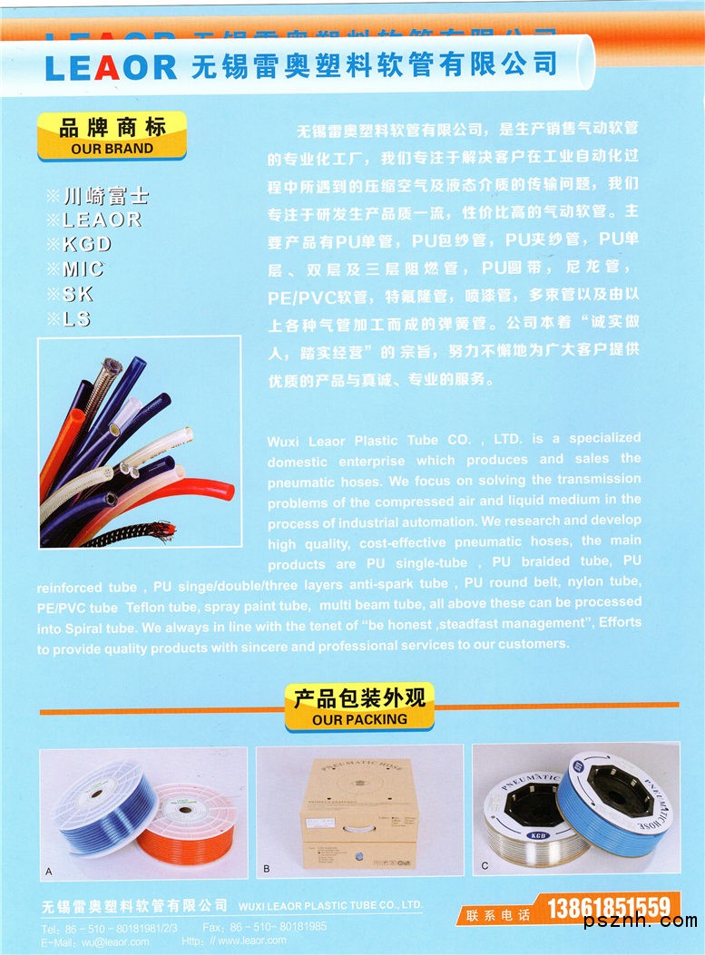 無錫雷奧塑料軟管有限公司,是生產(chǎn)銷售氣動軟管的專業(yè)化工廠。我們專注于解決客戶在工業(yè)自動化過程中所遇到的壓縮空氣及液態(tài)介質(zhì)的傳輸問題,我們專注于研發(fā)生產(chǎn)品質(zhì)一流,性價比高的氣動軟管,主要產(chǎn)品有PU單管、PU包紗管、PU夾紗管、PU單層及雙層阻燃管,PU圓帶、尼龍管、特氟隆管、噴涂管、多束管以及由以上各種氣管加工而成的彈簧管。公司本著“誠實做人,踏實經(jīng)營”的宗旨,努力不懈地為廣大客戶提供優(yōu)質(zhì)的產(chǎn)品與真誠、專業(yè)的服務(wù)。產(chǎn)品規(guī)格齊全,并可按需訂做各種特殊型號,以滿足不同客戶的需求。目前,產(chǎn)品已遠(yuǎn)銷韓國、日本、泰國、加拿大、美國等多個國家,深受用戶的信賴。
