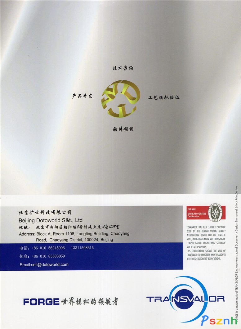 1. 主要致力于鍛造模擬軟件的開發(fā)完善,并在中國大陸銷售Transvalor系列軟件,并負(fù)責(zé)相關(guān)軟件售后服務(wù),我公司在售軟件包括Forge2009、 Forge2011、Thercast、Coldform。其中Forge2011所有模塊已經(jīng)由我公司完成了漢化,操作者很快就能掌握這個軟件的操作應(yīng)用。最新版本為FORGE@NXT1.1