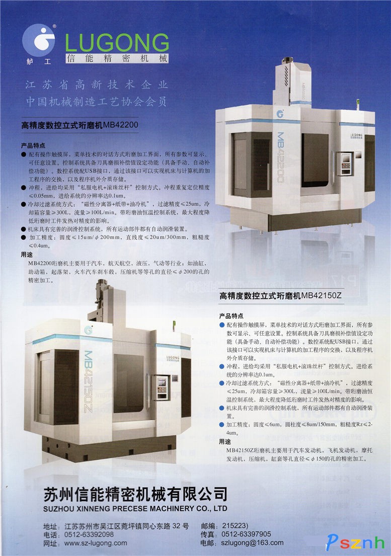 蘇州信能精密機械有限公司成立于2001年,是國家高新技術(shù)企業(yè)、江蘇省創(chuàng)新型企業(yè)、省級高精高效珩磨加工制造工程技術(shù)研究中心。公司主要生產(chǎn)"鱸工"牌系列珩磨機、珩磨工具,已形成"HM2000系列臥式珩磨機、MB4250系列高精度數(shù)控立式珩磨機、HMTB系列強力深孔珩磨機"三大系列18種產(chǎn)品,服務(wù)于中航工業(yè)西飛國際、中船重工紅江機器廠、西安航空動力、三一重工、奇瑞汽車、比亞迪汽車、鳳陽液壓(183廠)、中國兵器裝備建設(shè)機器廠、中國運載火箭研究院、中國航天5院、日本本田、德國博世、日本電裝、韓國現(xiàn)代等一大批國內(nèi)外知名企業(yè)。現(xiàn)年產(chǎn)、銷售各類珩磨機床300多臺,CBN珩磨油石15萬支,珩磨桿5萬支。
