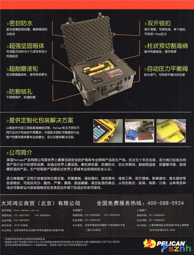 經(jīng)過三十年的發(fā)展, 派力肯已經(jīng)成為具有ISO9001:2000質(zhì)量認(rèn)證,在全球擁有700多名員工,具有注塑,生產(chǎn)和設(shè)計能力的世界著名的大型跨國集團。Pelican公司生產(chǎn)的系列專業(yè)防護箱和照明產(chǎn)品被廣泛使用于各種工業(yè)生產(chǎn),石油化工,電力,電子,核電,通信,航天航空,消防,公安,軍隊,政府,儀器儀表,科考,勘探,醫(yī)療,攝影攝像,物流運輸,搶險救援及戶外運動等行業(yè)。派力肯采用世界等級最高的原材料,加之專利配方和上乘生產(chǎn)工藝,創(chuàng)造出世界上最堅固,最抗摔抗震,防爆防水,抗化學(xué)腐蝕,耐極限溫度,質(zhì)量最可靠,使用最舒適的產(chǎn)品。生產(chǎn)的每款產(chǎn)品都經(jīng)過世界上權(quán)威專業(yè)機構(gòu)的安全認(rèn)證30多來年,Pelican公司致力于生產(chǎn)全世界最堅固的防護箱,并在業(yè)界有著良好的聲譽。