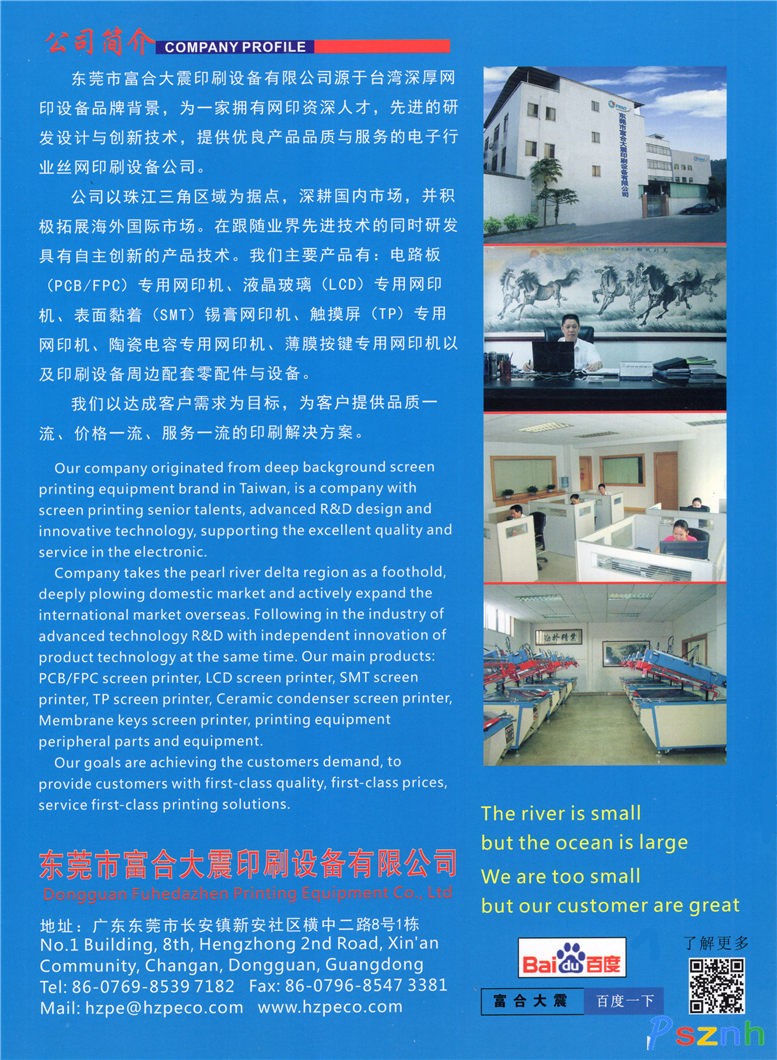 東莞市富合大震印刷設備有限公司源于臺灣深厚網印設備品牌背景,為一家擁有網印資深人才,先進的研發(fā)設計與創(chuàng)新技術,提供優(yōu)良產品品質與服務的電子行業(yè)絲網印刷設備公司。