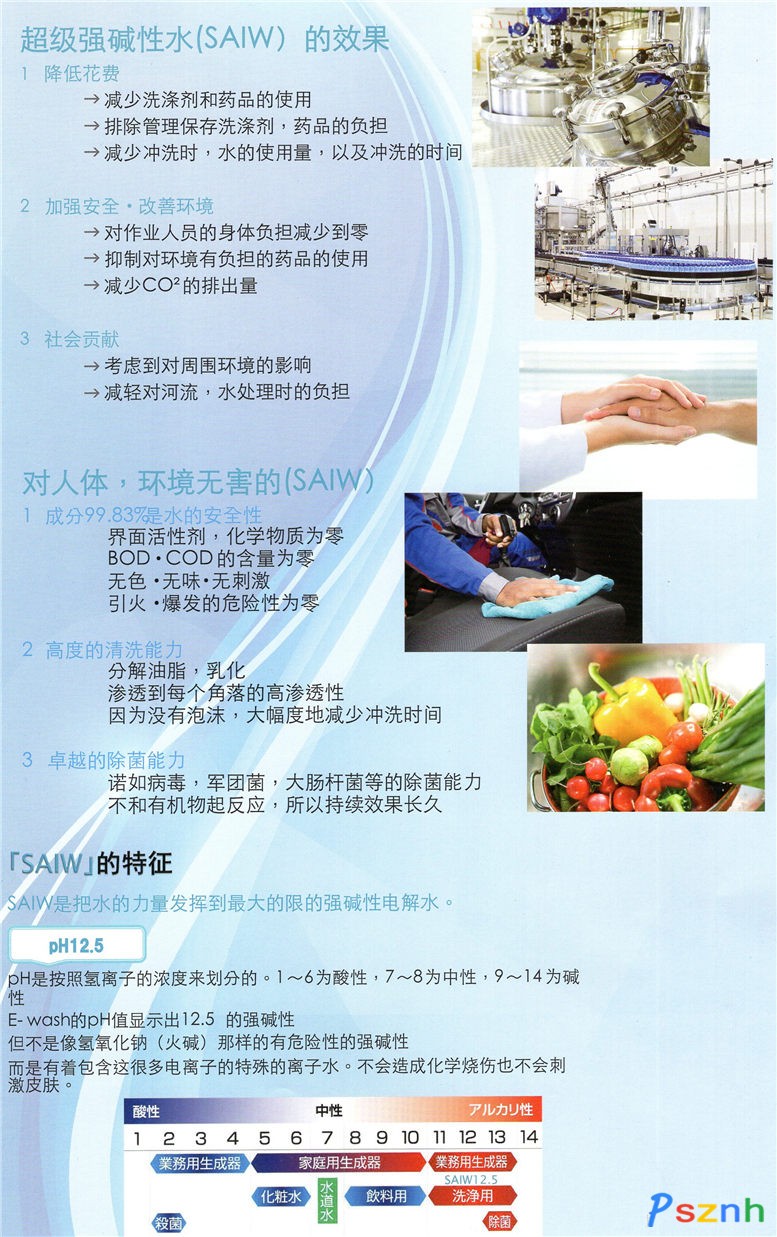 高堿性電解離子水是由0.17%氫氧化鉀(KOH)和純水而組成,不含其他化學物質。高堿性電解離子水沒有泡沫和殘余物,可以輕易地沖洗,因而減少沖洗時間和用水量。高堿性電解離子水是“用戶友好”和“生態(tài)友好”并免除限制的產品(比如*PRTR,*VOC和消防法律)。高堿性電解離子水不會導致表面底層受污染或水源污染。另外,COD 和BOD的數值是0,因此可以凈化工業(yè)廢水及簡單化處理過程。這可以減少水污染防治法的環(huán)保措施費用的成本。