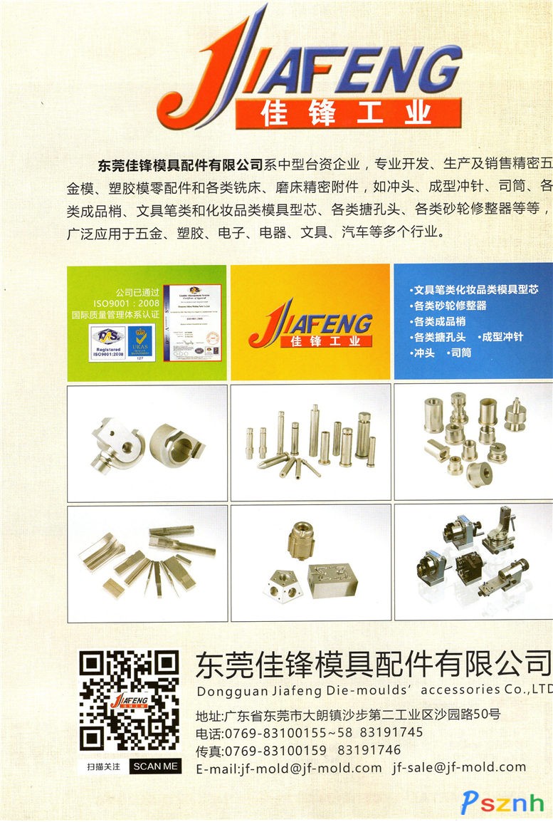 東莞佳鋒模具配件有限公司是一家臺商獨資對外加工企業(yè),始創(chuàng)于1998年,主要生產(chǎn)經(jīng)營五金模、塑膠模零件。幾年來,經(jīng)過公司領(lǐng)導(dǎo)和全體員工的不懈努力,佳鋒公司取得了一定規(guī)模的發(fā)展,不論是產(chǎn)品種類,還是加工工藝、技術(shù)水平都有了很大的提高,完成了從簡單的沖壓模到復(fù)雜的塑膠模和高精度端子模的轉(zhuǎn)變;客戶群體也由沿海不斷地向內(nèi)地深入,產(chǎn)品范圍覆蓋了五金、塑膠、電器、汽車、文具和化妝品等多個行業(yè)。
