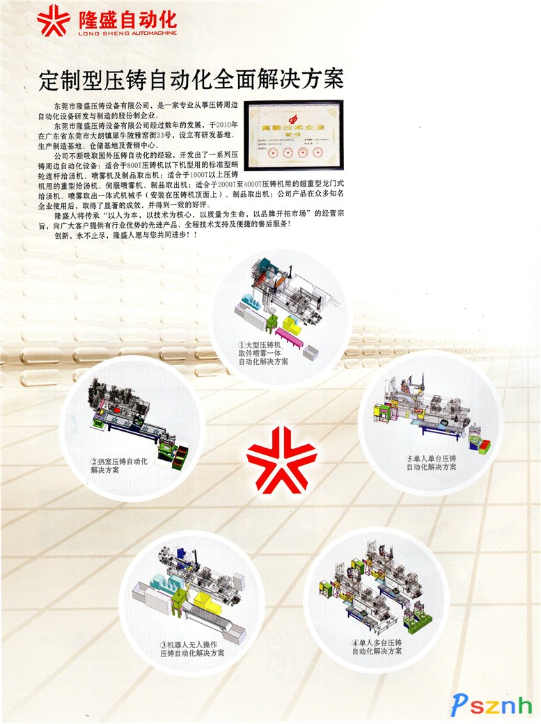 朗鎮(zhèn)犀牛陂雅窯街33號,設立有研發(fā)基地、生產(chǎn)制造基地、倉儲基地及營銷中心。公司不斷吸取國外壓鑄自動化的經(jīng)驗,開發(fā)出了一系列壓鑄周邊自動化設備:適合于800T壓鑄機以下機型用的標準型蝸輪連桿給湯機、噴霧機及制品取出機;適合于1000T以上壓鑄機用的重型給湯機、伺服噴霧機、制品取出機;適合于2000T至4000T壓鑄機用的超重型龍門式給湯機、噴霧取出一體式機械手(安裝在壓鑄機頂面上)、制品取出機;公司產(chǎn)品在眾多知名企業(yè)使用后,取得了顯著的成效,并得到一致的好評。隆盛人將傳承“以人為本,以技術為核心,以質量為生命,以品牌開拓市場”的經(jīng)營宗旨,向廣大客戶提供有行業(yè)優(yōu)勢的先進產(chǎn)品、全程技術支持及便捷的售后服務!創(chuàng)新,永不止盡,隆盛人愿與您共同進步!