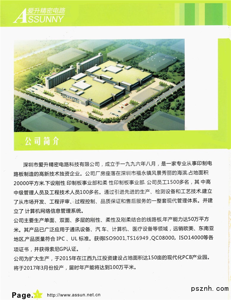 深圳市愛升精密電路科技有限公司,成立于一九九六年八月,是一家專業(yè)從事印制 電路板制造的高新技術(shù)獨(dú)資民營(yíng)企業(yè).近年來,公司規(guī)模高速擴(kuò)展.迅速朝集團(tuán)化方 向大步邁進(jìn)。