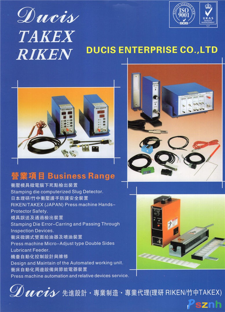 公司主要生產(chǎn)銷售微電腦下死點(diǎn)檢出器、模具誤送及通過檢出裝置、不銹鋼附自動(dòng)電磁閥給油桶,雙面給油器,噴油器,自動(dòng)化設(shè)備。代理之沖床護(hù)手防護(hù)安全裝置更是日本三大產(chǎn)品:理研光電產(chǎn)品、竹中之品牌、杉山之檢知器。