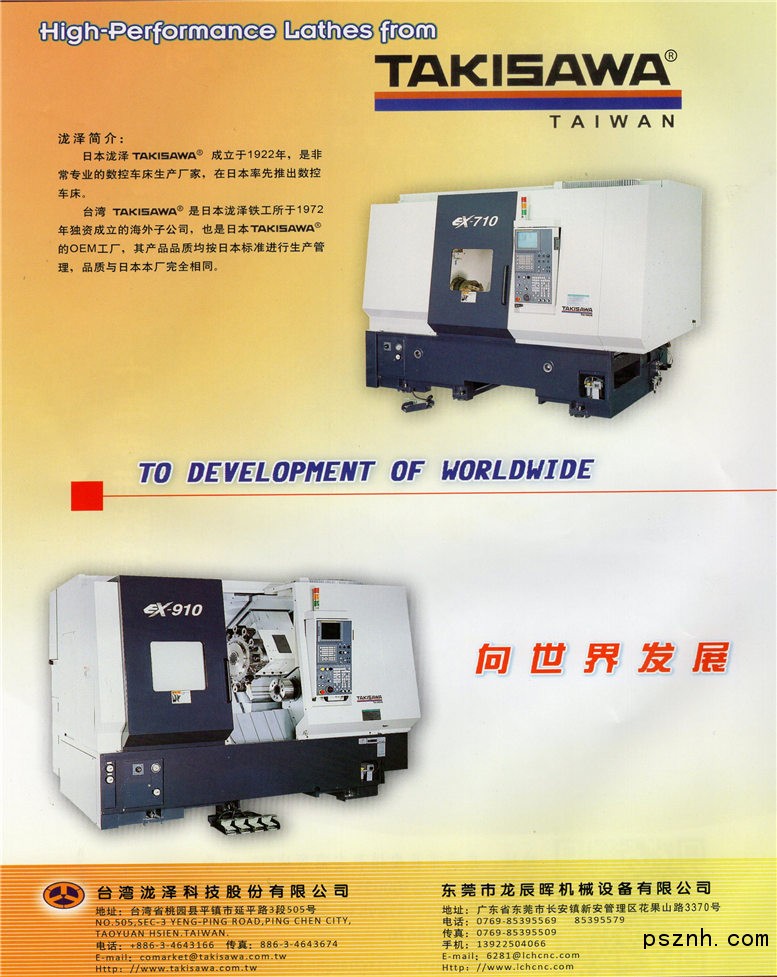 日本瀧澤(TAKISAWA)成立于1922年,是非常專業(yè)的數(shù)控車床生產(chǎn)廠家,全日本第一臺數(shù)控車床即由瀧澤推出,在車床領(lǐng)域有著自己非常專業(yè)和獨到的技術(shù)。 瀧澤公司于1972年獨資成立海外子公司臺灣瀧澤科技股份有限公司,主要從事瀧澤車床的組裝生產(chǎn)。臺灣瀧澤也是日本TAKISAWA的OEM工廠,其產(chǎn)品的品質(zhì)均按日本標(biāo)準(zhǔn)進(jìn)行生產(chǎn)管理,品質(zhì)與日本本廠完全相同。隨著近40年的發(fā)展和不斷創(chuàng)新,更有瀧澤人的不斷探索和奮斗,瀧澤CNC數(shù)控車床已成為亞洲車床業(yè)的第一品牌,產(chǎn)品行銷于世界各地,贏得客戶極好的口碑。