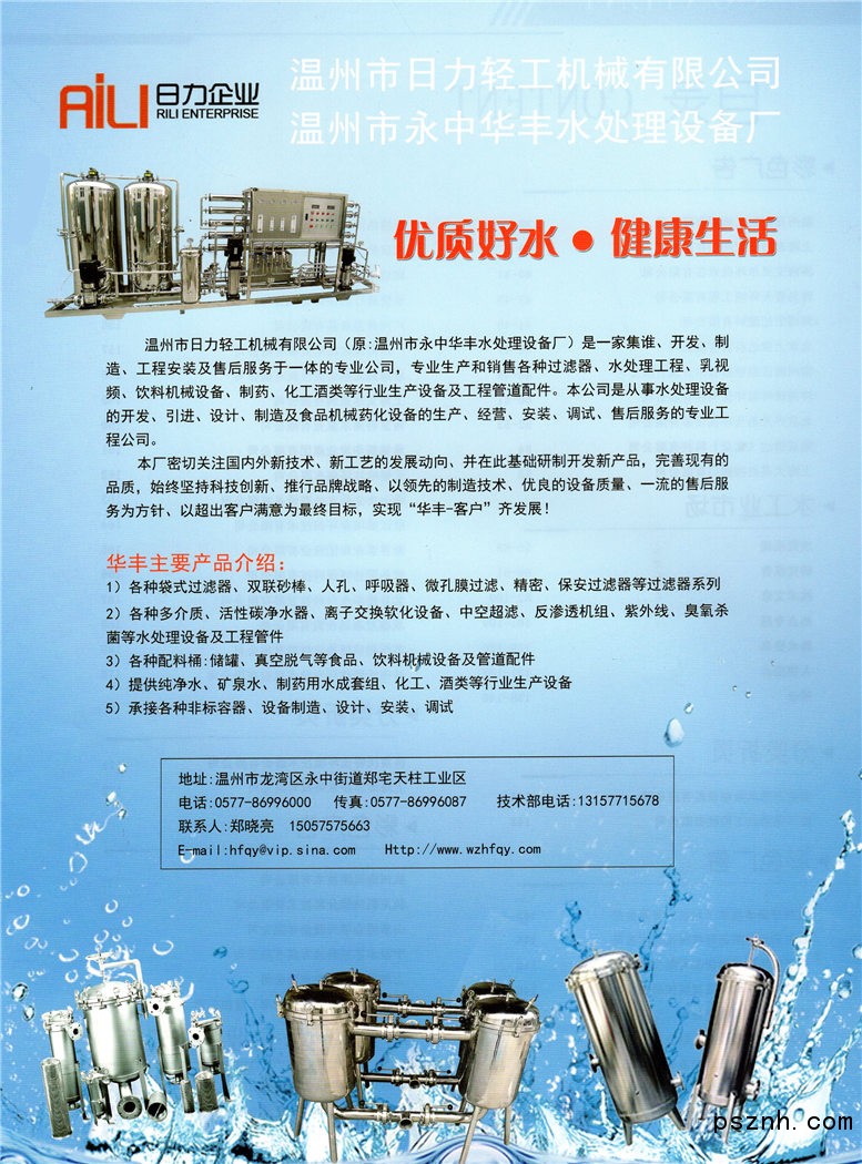 溫州市日力輕工機械有限公司_反滲透裝置及膜_ 超濾裝置及膜應(yīng)用_軟化與除鹽設(shè)備_紫外線殺菌器_臭氧殺菌裝置_變頻恒壓供水系統(tǒng) _過濾器_食品飲料機械設(shè)備_濾芯濾膜_純凈水_礦泉水成套設(shè)備_中空超濾設(shè)備點擊:1630 評論:0 查看原圖 |
