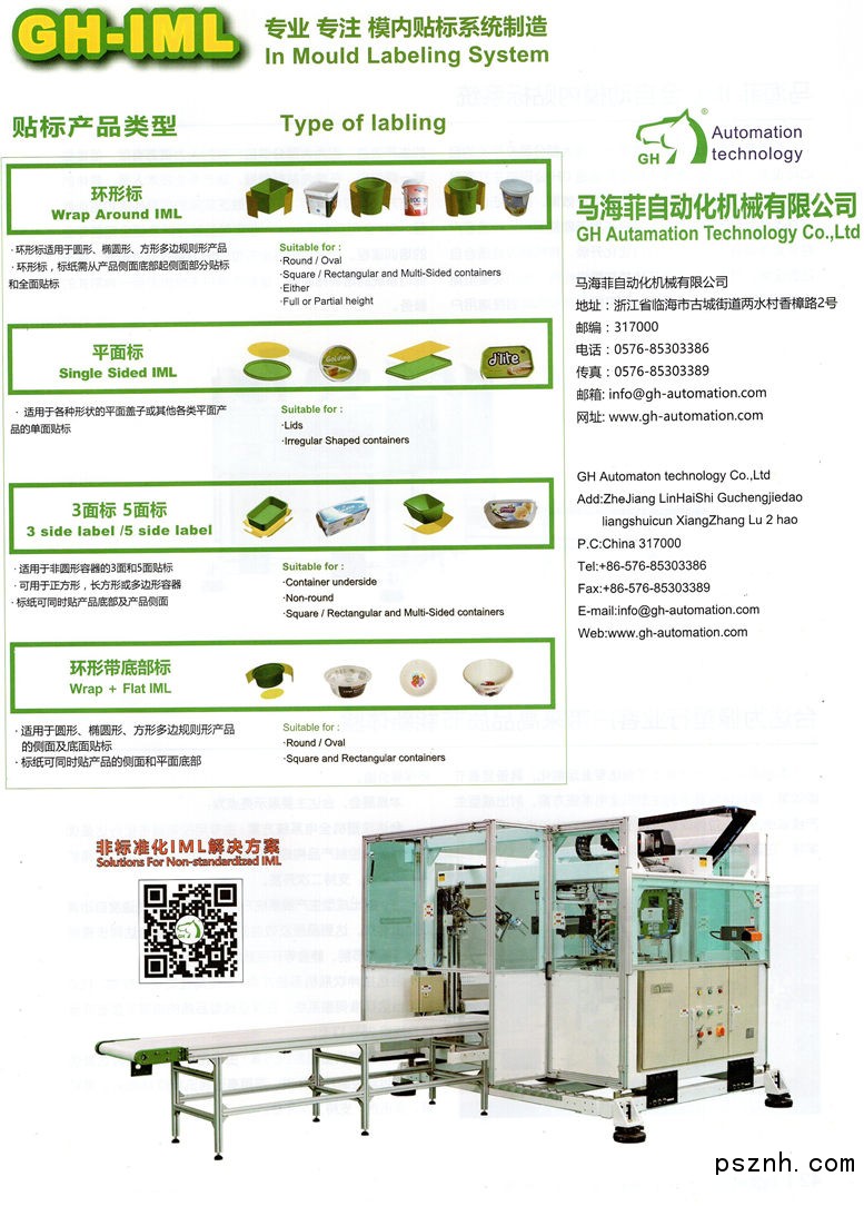 GH自主研發(fā)、生產(chǎn)并銷售了400余套各種系列的模內(nèi)貼標(biāo)(IML)系統(tǒng)。成熟的擁有一模八穴以上的各式貼標(biāo)方式:平面標(biāo)、環(huán)形標(biāo)、三面和五面標(biāo)、環(huán)形加底面標(biāo)。我們最大可進(jìn)行1M×1M桌面平面標(biāo)、20L圓桶環(huán)形標(biāo)。