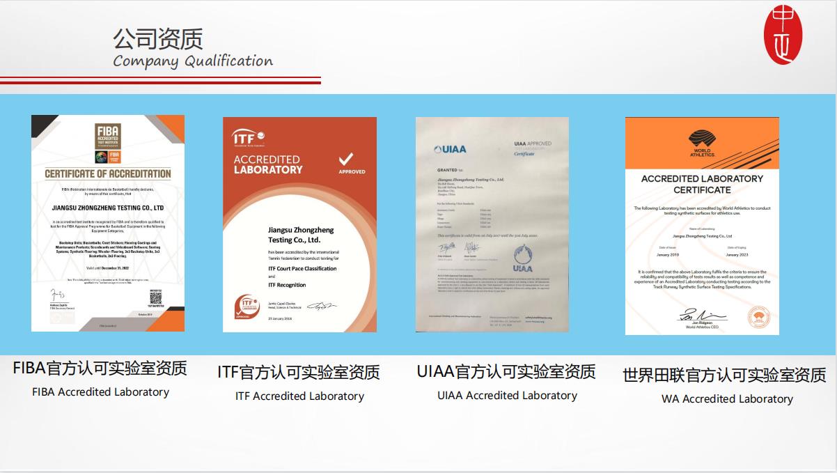 江蘇中正檢測(cè)股份有限公司作為國(guó)際田聯(lián)IAAF、國(guó)際籃聯(lián)FIBA、國(guó)際網(wǎng)聯(lián)ITF、國(guó)際登聯(lián)UIAA、國(guó)際羽聯(lián)BWF、國(guó)際足聯(lián)FIFA、國(guó)際手聯(lián)IHF等體育場(chǎng)館項(xiàng)目亞太區(qū)技術(shù)服務(wù)合作伙伴,江蘇中正檢測(cè)股份有限公司在中國(guó)區(qū)建立官方認(rèn)可實(shí)驗(yàn)室,為亞太地區(qū)提供公正、科學(xué)、安全、健康、環(huán)保的檢測(cè)認(rèn)證服務(wù)。