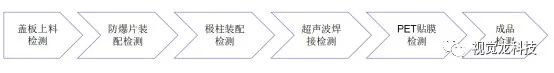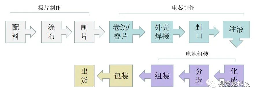 鋰電池的生產(chǎn)流程多,工藝相對復(fù)雜。從整個制作流程來看,大致可以分為極片制作、電池單元(電芯)制作和電池組裝三個工段。本次主要針對第三個組裝工段提供視覺線體解決方案。