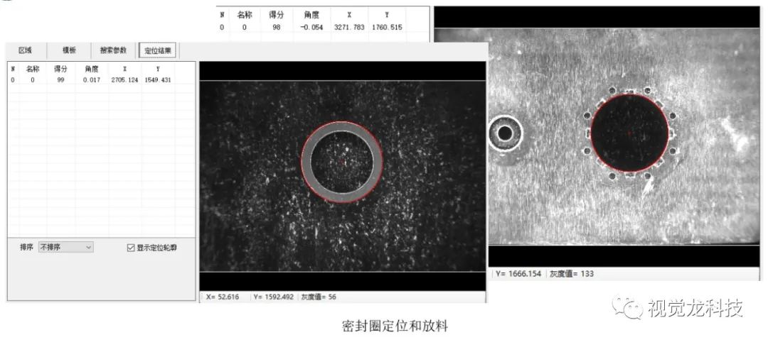 采用飛拍方式,獲取密封圈在機(jī)械手上坐標(biāo)與放料位坐標(biāo)信息后,視覺引導(dǎo)機(jī)械手裝配。