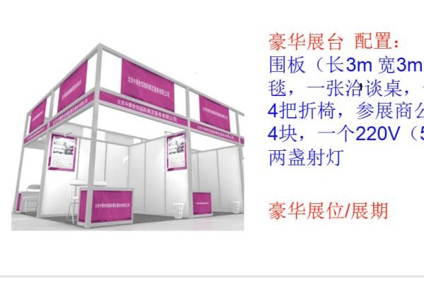 標(biāo)準(zhǔn)展位價格:24,000元/9m平方米;標(biāo)準(zhǔn)展位含中(英)文楣板字、咨詢桌1張、椅子2把、射燈2盞、220V電源插座1個、紙簍1個。