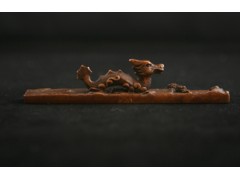 鎮(zhèn)尺是放置在書桌案頭上的文房用品,又叫紙鎮(zhèn)或鎮(zhèn)紙。古代文人在書房中,常將小型的青銅器、玉器放在案頭欣賞,同時用來壓紙或者壓書。明清兩代,書畫名家輩出,極大的促進(jìn)了文房用具的制作和使用,鎮(zhèn)紙的制作材料和造型也有了新的變化,形狀大上多為長方形,銅因其體重為鎮(zhèn)紙較為普遍?!段木哐啪帯分杏性敿?xì)介紹:““銅者,有青綠蝦蟆,偏身青綠;有蹲虎、蹲螭、眠龍;有坐臥哇哇、有鎦金辟邪、臥馬,皆上古物也”。 此件鎮(zhèn)尺是典型的明清仿漢玉器造型風(fēng)格,長方形尺上臥一螭龍。關(guān)于螭龍有兩種說法:一說中國古代漢族傳說中的龍的來源之一。也稱蚩尾,是一種海獸,二說是龍九子中的二子,古書中云:“其二曰螭吻,性好望,今屋上獸頭是也?!备鶕?jù)以上的說法,螭龍的原形應(yīng)該是我們生活中的壁虎。前人分龍為四種:有鱗者稱蛟龍;有翼者稱為應(yīng)龍;有角的叫虬龍,無角的叫螭。其中“無角的”便是螭龍。螭龍被漢族民間認(rèn)為寓意美好,吉祥,也寓意男女的感情。 自古及今,鎮(zhèn)尺形制多樣,制作者爭奇斗巧,變化萬端,是文人案頭的寶玩之一。 與筆墨紙硯四寶相類,鎮(zhèn)尺可稱為古代文人文房中的“小五”。此件鎮(zhèn)尺造型精巧、工藝精湛,是一件集實(shí)用性與觀賞性的藝術(shù)珍品。| 生產(chǎn)地址 | 西安 |